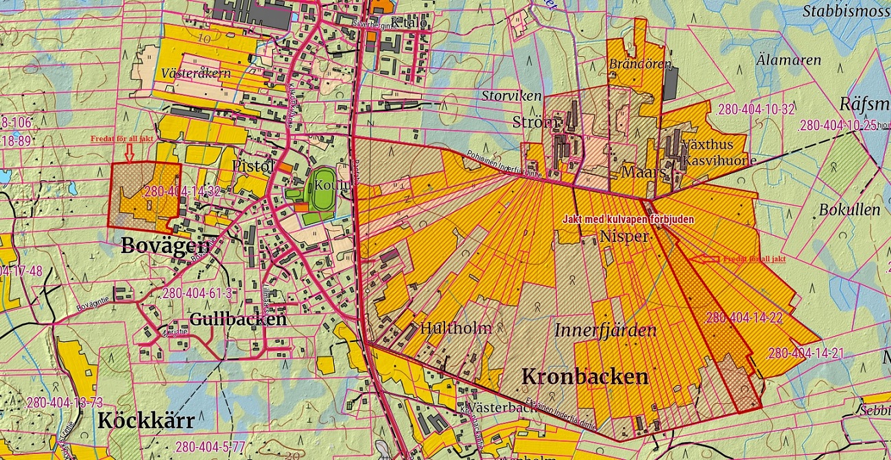 De rödrutade områdena, lägenhets nr: 14:22 i Inderfjärden samt 14:32 i Boviken, är fredade för all jakt.